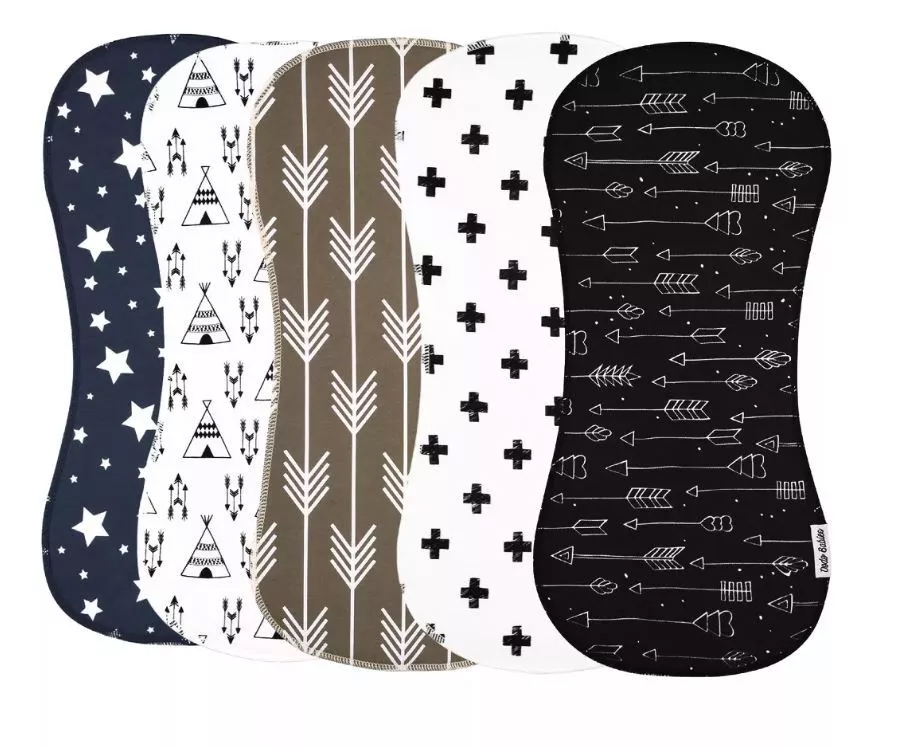 This 5-pack of burp cloths from Dodo Babies comes in 5 different sweet patterns. Each cloth is 19 long by 9 wide, with a gently curved indentation along both edges. Theyre an ideal size (and shape) for tossing over your shoulder to catch your babys spit-up or drool. The front side of each cloth is 100% organic cotton, while the back is 100% polyester fleece. Both sides are soft enough for newborn skin and absorbent enough to protect clothing. We suggest hanging these burp cloths to dry after washing, to prevent shrinkage. Each unisex gift set of 5 burp cloths comes with a handy pacifier case and 2 pacifier clips (for attaching your babys pacifier to their clothing). The clips have fabric straps in coordinated patterns and colors. Dodo Babies is committed to providing essential new baby gear in soft fabrics and stylish patterns, for happy infants and happy parents. This 8-piece set is an ideal gift for yourself or any other new parent.