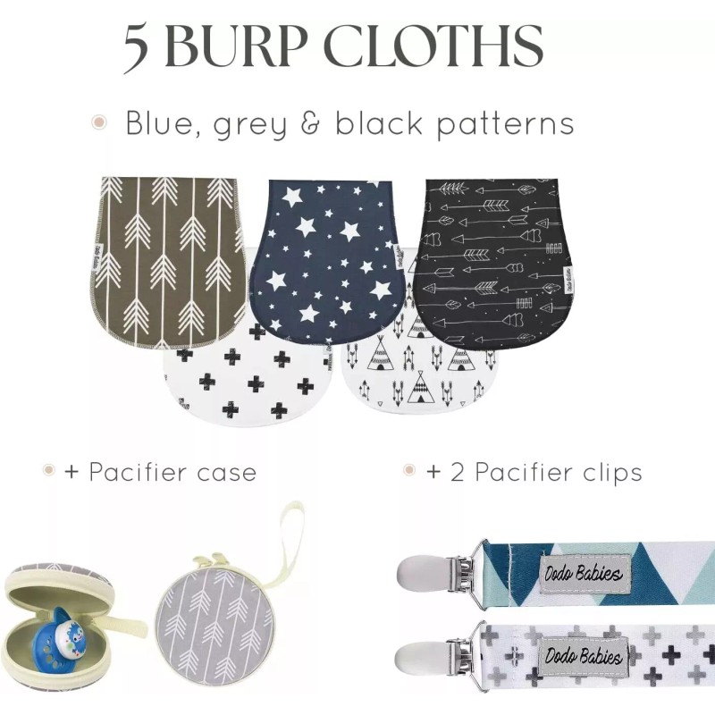 Dodo Babies 5-Pack Baby Burp Cloth with 2 Pacifier Clips and 1 Case