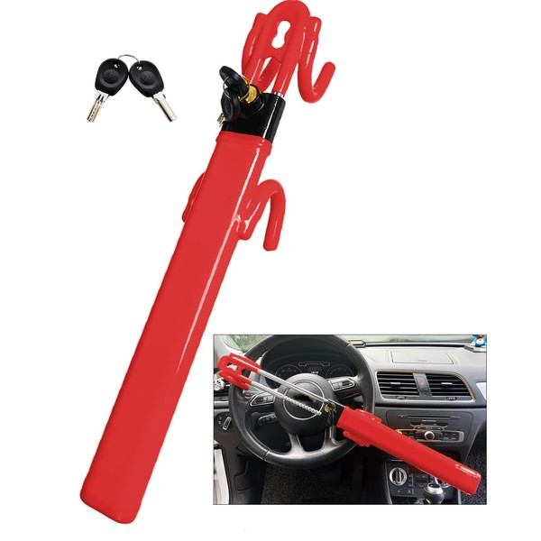 Dodomes Steering Wheel Lock Anti-Theft Heavy Duty Secure Car Device, Adjustable Length Clamp Double Hook Locks Universal Fit (Red)