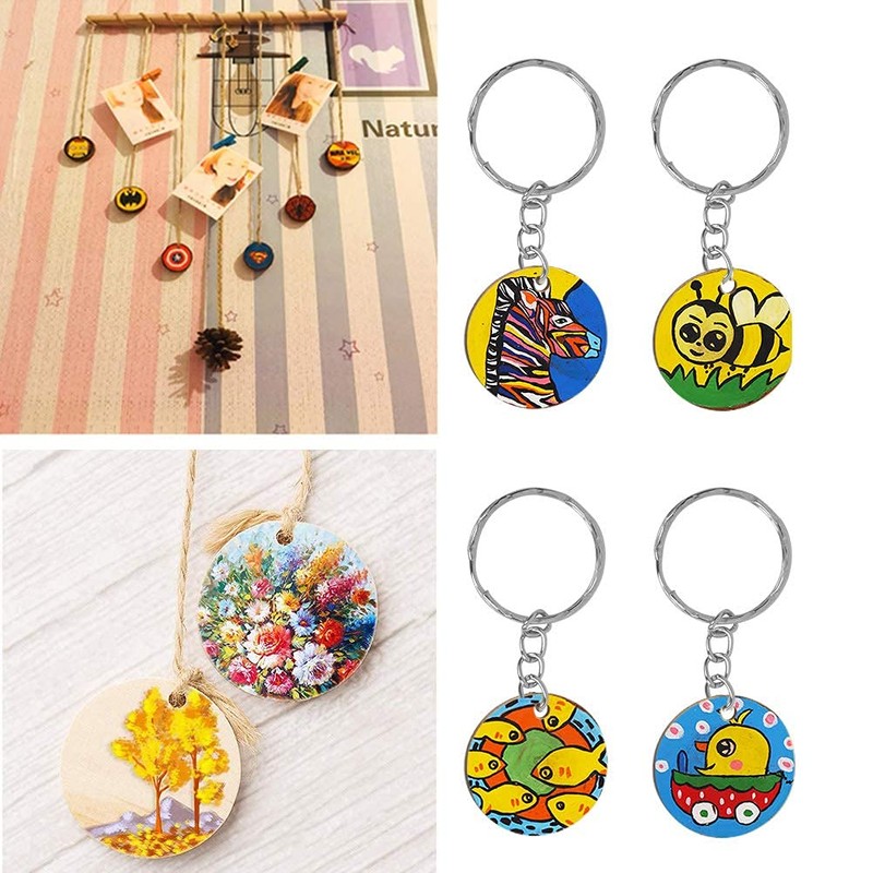 - 【Wood Slices for Craft DIY】--The surfaces of wooden discs for keyrings are empty and smooth. You can paint or write whatever you want in blank wooden keyring. Unfinished circle wooden discs are great for hangers, labels, card making, embellishments, scrap booking, decoupage, signs, plaques and many other arts and crafts projects.