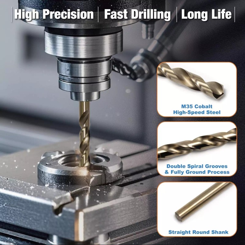 - 【Excellent Quality】M35 HSS cobalt drill has excellent cutting performance and significantly improved wear resistance. It can quickly drill through various metal materials, reduce processing time, extend the service life of the tool, and reduce the frequency of replacement. After special heat treatment, the hardness of M35 high-speed steel containing 5% cobalt can reach above HRC65, which improves the red hardness and wear resistance of twist drills and is suitable for processing high-hardness materials.