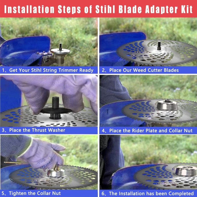 - Blade Adapter Attachment Kit for Stihl Trimmers: 1x Thrust Washer(10 teeth)/ 1x Rider Plate/ 1x Lock Nut(m10x1.0)/ 1x Screwdriver.