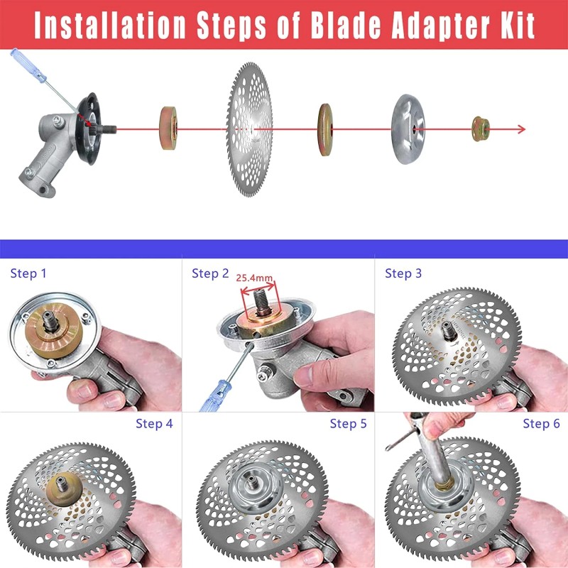 - Blade Adapter Kit for Straight Shaft Trimmers with 1 Inch Arbor: 1x Thrust plate guard washer (6 teeth)/ 1x Thrust washer/ 1x Rider plate/ 1x Lock nut(m10x1.25).