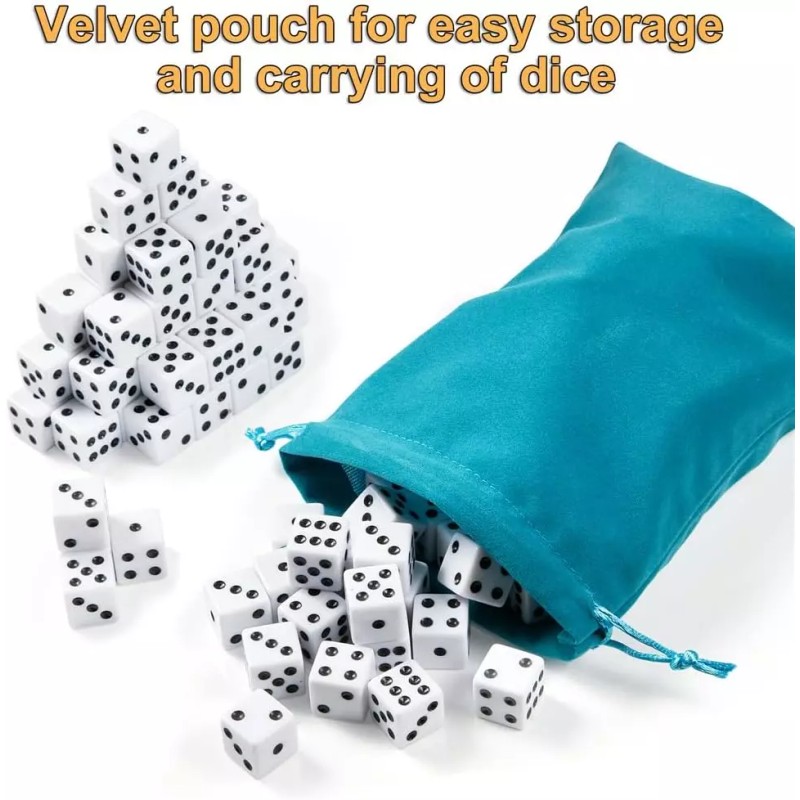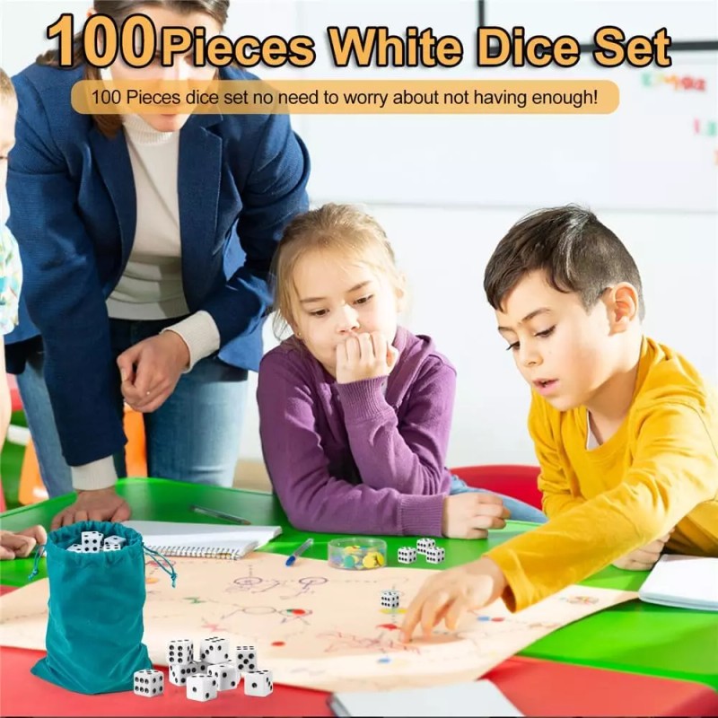 This 100-piece set of white dice includes 16mm standard game dice, opaque six-sided dice with a pouch, and bulk white dice with black dots for group activities, board games, and math classes.