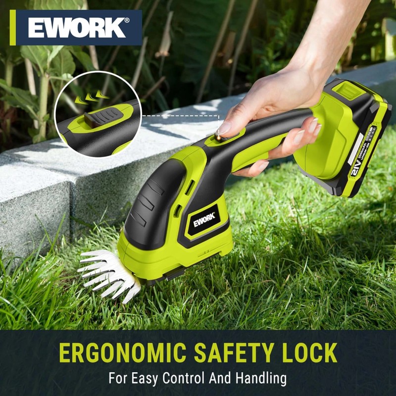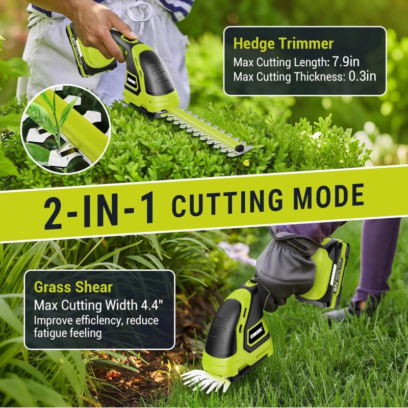 - ✅ EWORK 2-in-1 Cordless hedge trimmer and grass shears with battery and charger. Easily switch hedge trimmer and grass shears. 21V electric hedge trimmer cordless has strong power and lightweight design(Only 1.8Lbs), which is more suitable for bush and grass pruning in home gardens