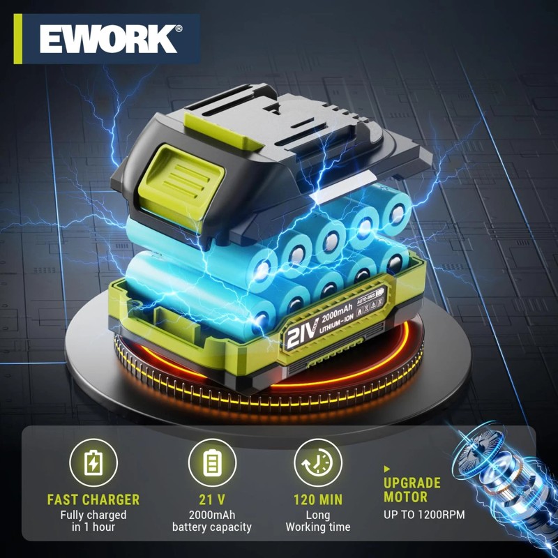 - ✅ UL-Listed fast charger & High-performance 2000mAh lithium battery, 60-minute fast charger – enjoy 60+ mins continuous runtime. Battery has a built-in intelligent protection system. Compatible with EWORK 21V series (Leaf Blower/String Trimmers). 500+ cycle battery lifespan tested. Battery Management System (BMS) actively guards against overcharging/overheating/short circuits while maintaining 80% capacity after 800 cycles