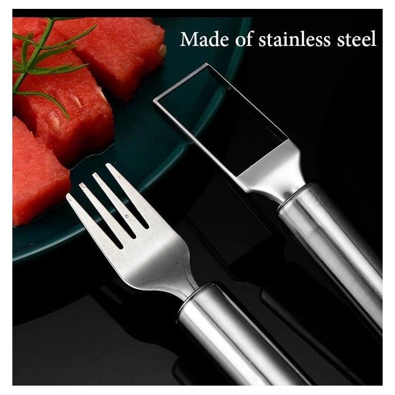 - Suitable for Most Fruits: 2-in-1 Fruit cutter is a game-changing kitchen gadget designed to simplify your fruit slicing routine. melon slicer sharp, stainless steel blade glides through watermelons and so on, cut the fruit into your desired shape, and Then, you can easily pick up the pieces with the fork on the other side, placing them on a plate or enjoying them directly