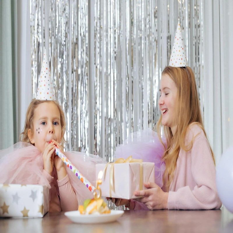 - 2 Packs of Sparkle: Get 2 silver foil fringe curtains, each 3.2ft x 8.2ft. Hang them across your doorway for an instant, glittering backdrop that wows your guests.