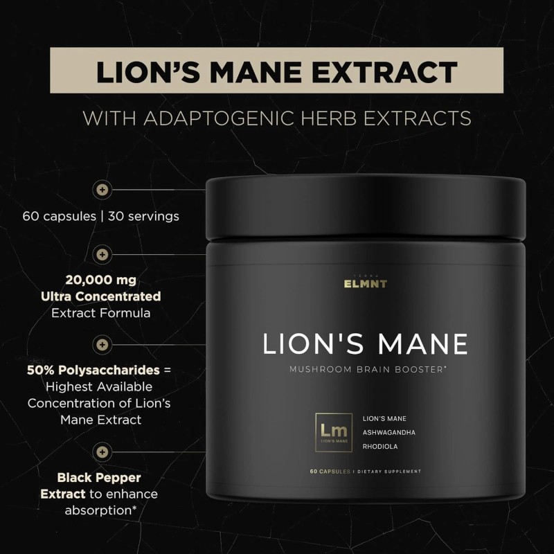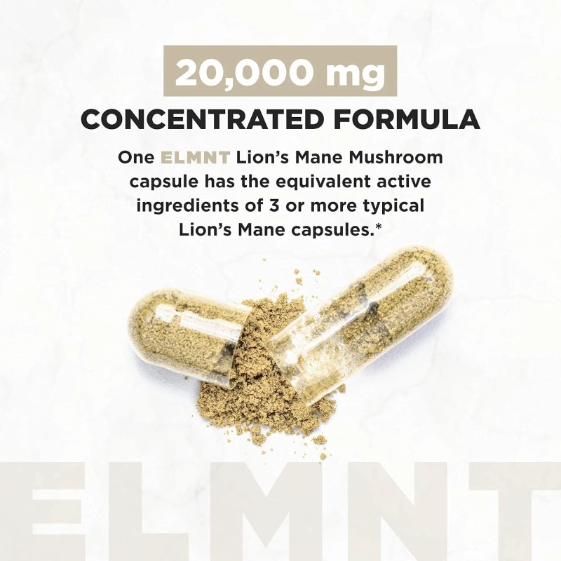 - [16X STRENGTH LIONS MANE SUPPLEMENT] Made with 1,000mg of the ultra high concentration Lion's Mane Extract standardized to 50% Polysaccharides and made from fruiting bodies for maximum potency. Just one terra ELMNT's Lion's Mane Extract capsule has more active ingredients than 4-6 capsules of average lions mane supplements.*