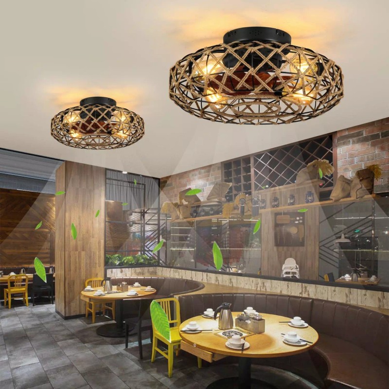 - Our low profile ceiling fan with light is the natural handmade hemp rope cage design adds vintage style to your living space, and the bohemian rattan shade is designed to spread light evenly throughout the room, creating a beautiful light and warm atmosphere.