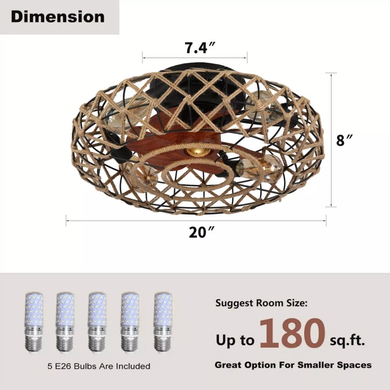 - The Caged Ceiling Fan with Light fixture dimension is 20×20×8inch. The semi flush mount is handcrafted from hemp rope, which is exquisite and durable.The metal inner frame makes the cage-shaped lamp less prone to deformation and more aesthetically pleasing