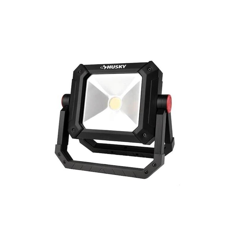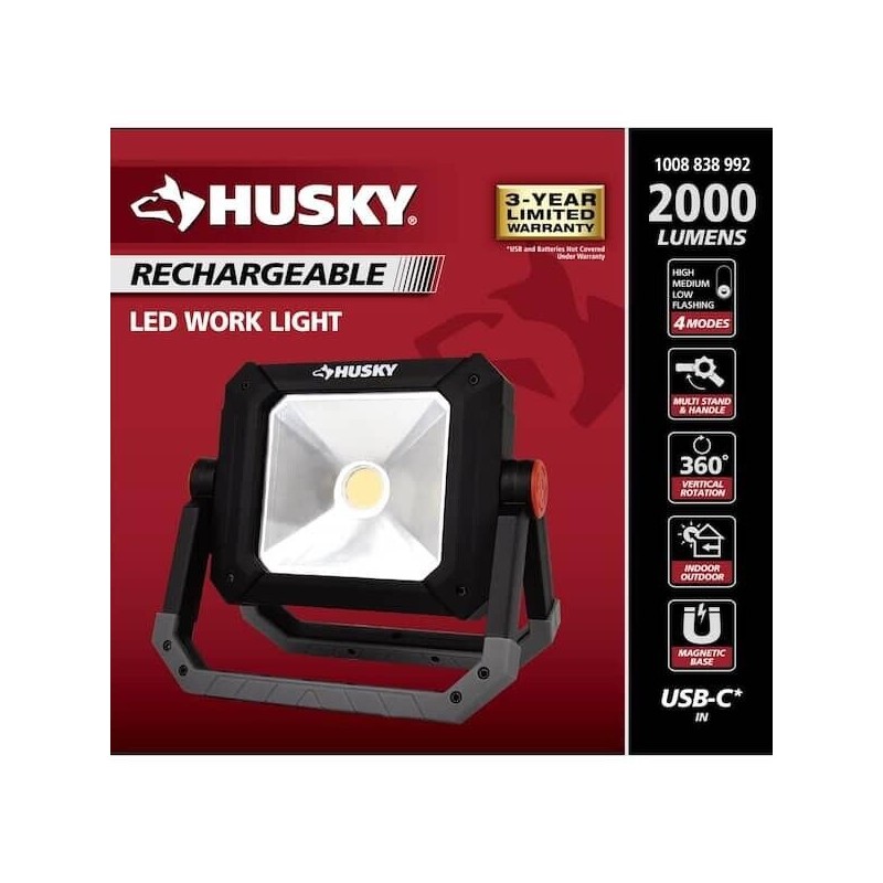 Husky 2000 Lumens Rechargeable LED Work Light has 4 modes: High-mid-low-strobe. Besides the convenient rechargeable function, it also works as a power bank and charge for other devices. It provides ample lighting with its super bright and long-lasting LED. It can work with or without tripods and its easy grip handle also allows it to be transported with ease. The reinforced light edge and handle make it durable to use yearly round. Featuring 360° vertical rotation, never been that easy to adjust the light angle, ideal for indoor and outdoor use.