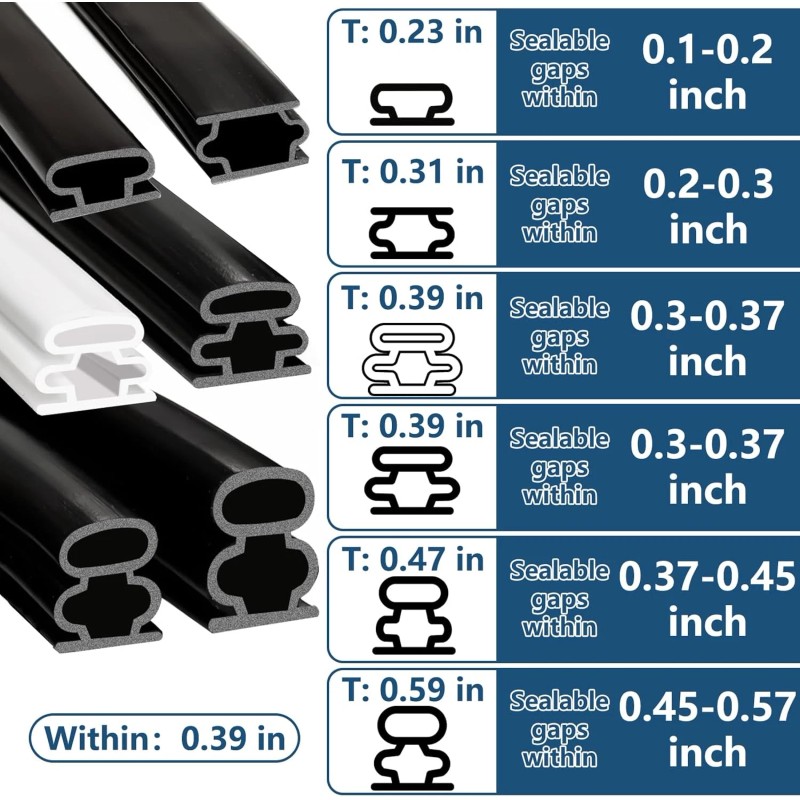 - Weather Stripping: The door insulation strip measures 20ft in length, 0.39 inches in width, and 0.39 inches in height, sealing gaps within 0.3-0.37 inches. Please measure your gap size before purchase.