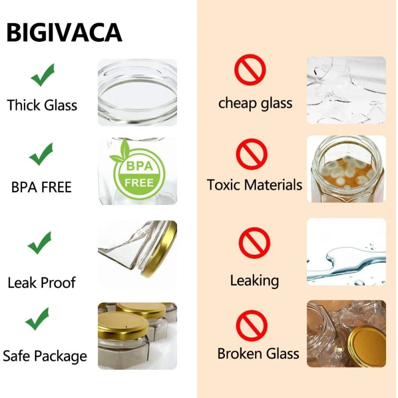 - Package Include:30 pcs 3 oz hexagon glass jars, 30 pcs golden lids,30 pcs gold bee pendants, 16m jutes,35 pcs honey lables,30 pcs ndividually packing wood dippers