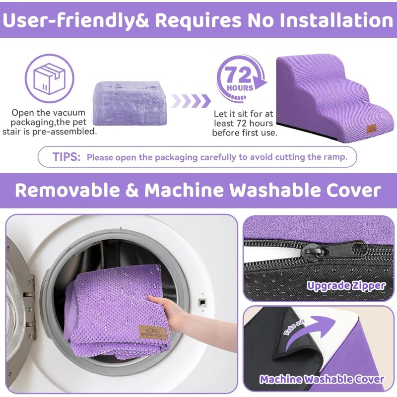 • No Assembly Required & Easy to Clean: When you open the packaging, the pet stair is already assembled. Before the first use, it should be left standing for at least 48-72 hours for the foam to fully expand. NOTE!! Open the packaging carefully to avoid cutting the stair! The outer cover can be removed for cleaning and supports machine washing or hand washing. Please note that the inner foam is not washable.