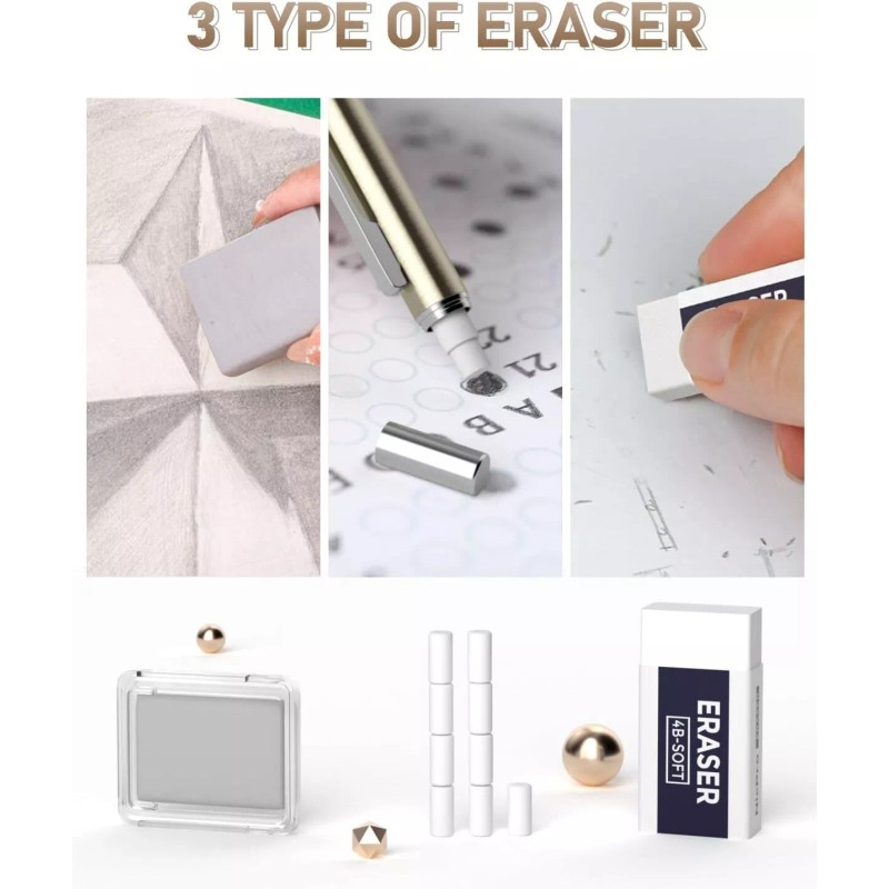 35PCS Upgraded Version Artist Set:Come with 6 PCS drafting pencils and 20 tubes of lead refill in 0.5 mm & 0.7mm & 0.9mm & 2.0 mm, 3 pcs 4B erasers, 1 pcs kneaded eraser, 18 pcs cap eraser refills, 2 pcs lead sharpener, a storage case.