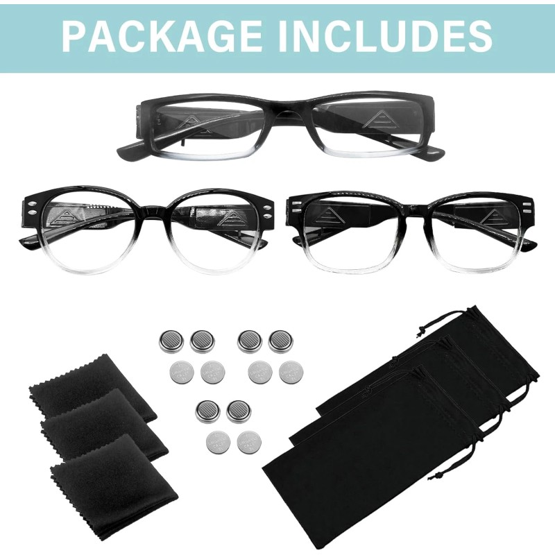 These LED glasses are convenient for many tasks--built-in LED bright lights on each side of the frame, Dual battery mode lasting power, give you clear bright vision in the dark. Perfect for use in the car, in bed, on a plane, on a camping trip, or in a place too dark to read without disturbing others around you. Or for trying to locate something in the dark while keeping your hands free.