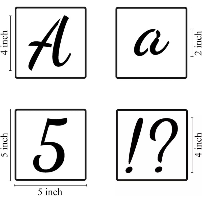 - ☆ EASY TO USE: These stencils can save you a lot of time when creating crafts, you can customize words and numbers to create any art projects you want. You just put them on the surface of the object, paint with a brush or spray with a spray gun, simply do it! They are reusable, easy to clean with soap and water. The reasonable size is easy to store. Size: stencil 5"x 5", letter height: uppercase letter about 4", lowercase letter about 2".