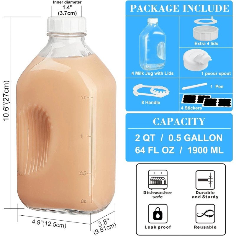 - Item List: All Glass Milk Jugs are packed in a securely package, and except for 4 glass containers with lid, also come with extra 4 Lids with silicone gaskets, 8 handles, 1 pour spout, 4 stickers, meet daily needs, with longer usage time and save money