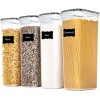 - MULTI-PURPOSE FOR DIFFERENT FOOD STORAGE--- Our tall food storage containers for pantry are suitable for spaghetti containers. Ideal for storing kinds of pasta, spaghetti, noodles, dry food like oats, grain, rice, cereals, nuts, corn, chips, snacks, coffee, tea and beans. They are also ideal for storing kinds of baking supplies, such as flour and sugar.