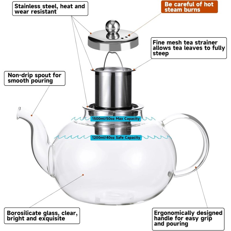 • EXCEPTIONAL CLARITY AND VISUALLY STUNNING : This transparent, crystal clear teapot is very attractive and soothing to your eyes. It is particularly suitable for brewing floral teas, allowing you to watch the leaves and flowers unfurl as they infuse flavor and aroma in hot water. Brewing tea with this teapot will also make you an expert in the visual properties of tea, accurately judging the flavor of the tea by its color, and determining when to pour the tea.