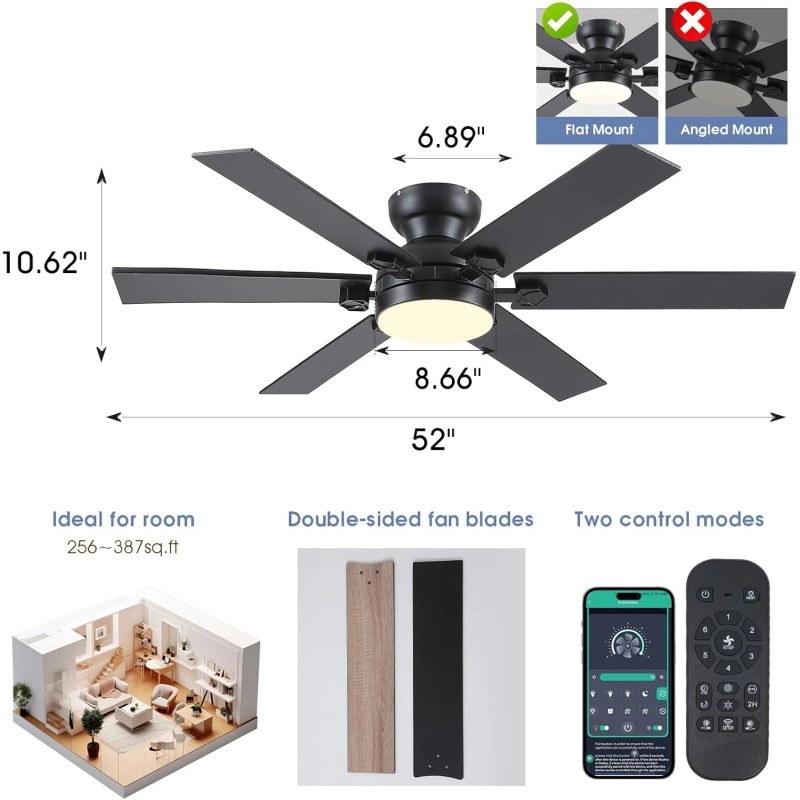 - [Ultra-quiet DC motor & 6-blade]:52"black ceiling fan with 6 wooden blades features a pure copper DC motor with thickened silicon and copper wire(suits for 90~265 volt), the powerful motor can produce strong even airflow without shaking at very low noise level, easily creates a comfortable living environment (noise below 35 dB), ideal for indoor and outdoor with cover (Not directly exposed to rain).