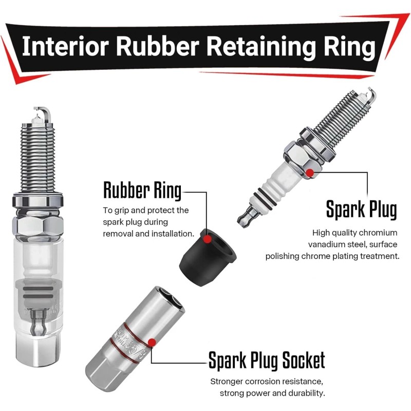 · 🚗【6 Point Design】6 Point sockets feature a built-in rubber ring that prevents spark plugs from slipping out during use. Each socket has a rubber support system inside to help protect and hold the spark plugs, extension bar, and universal joint help the socket to be long enough to go deep and accommodate the size of the spark plugs.