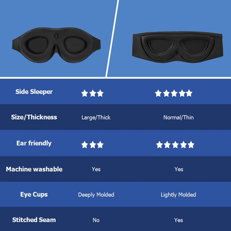 - Unique shaped eye cups & nose cutout - Never press against eyeballs, eyelashes or nose and yet create a perfect seal that blocks all light out no matter if you're a back, stomach or sensitive side-sleeper