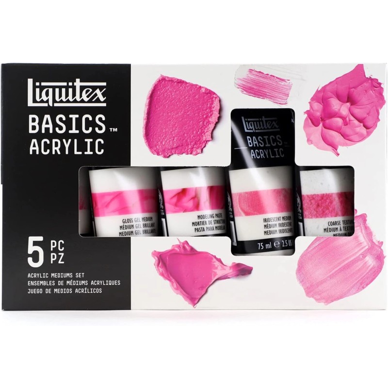 Basics mediums are developed for students and artists that need dependable quality at an economical price. Basics mediums are mixed with acrylic paint to adjust how the paint works, feels and looks. They can be used to add texture, adjust paint flow, and alter the working properties of the color. Because they include acrylic resin, these mediums maintain or add to the stability of the paint film, and can be used in any amount desired. Contains 5 75ml/2.5-oz tubes. Modeling paste, gloss gel medium, Gesso, iridescent medium, and coarse texture gel.