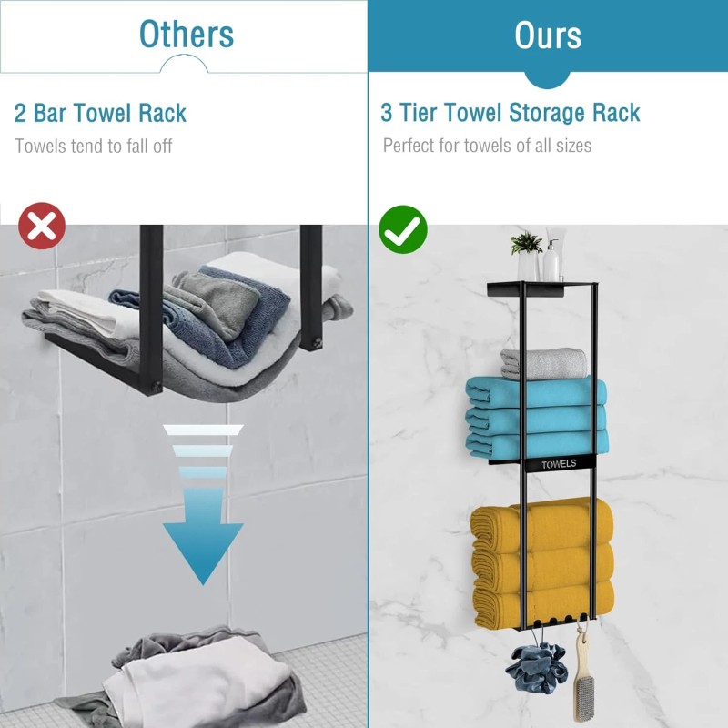 • 【New Upgraded 3 Tier Storage】Our bathroom towel rack is designed with 3 tiers, which is convenient for sorting different towels and provides more support without collapsing or falling. Or you can also place other small items.