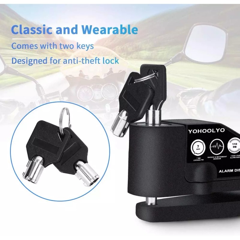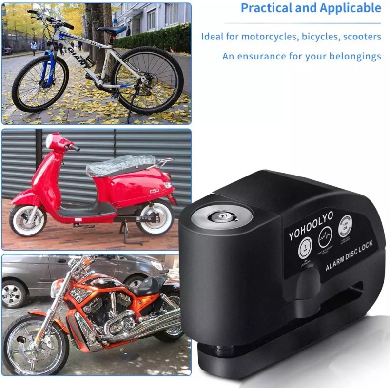 (Bloqueo de Freno de Disco de Doble Garantía con Alarma para Vehículo) es ideal para motos, bicicletas, scooters, motos de cross y cualquier vehículo donde haya agujeros o radios en una rueda.
