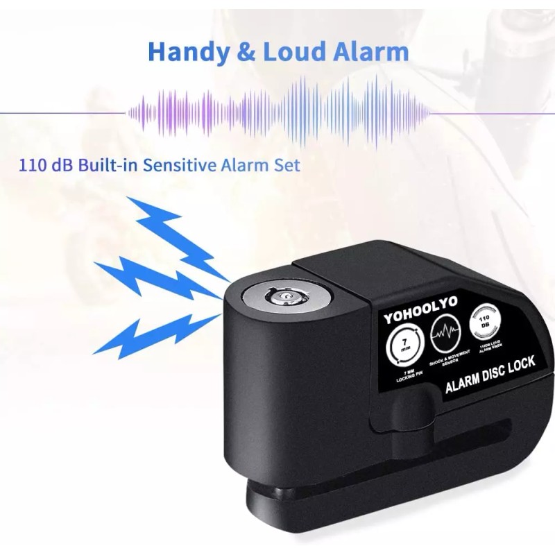 (Bloqueo de freno de disco con alarma resistente a choques e impermeable) El sonido de la alarma es capaz de alcanzar 110 db, la medida del pasador de bloqueo es de 7 mm que nos permite configurarlo en 360 grados, y es posible fijarlo en cualquier posición.