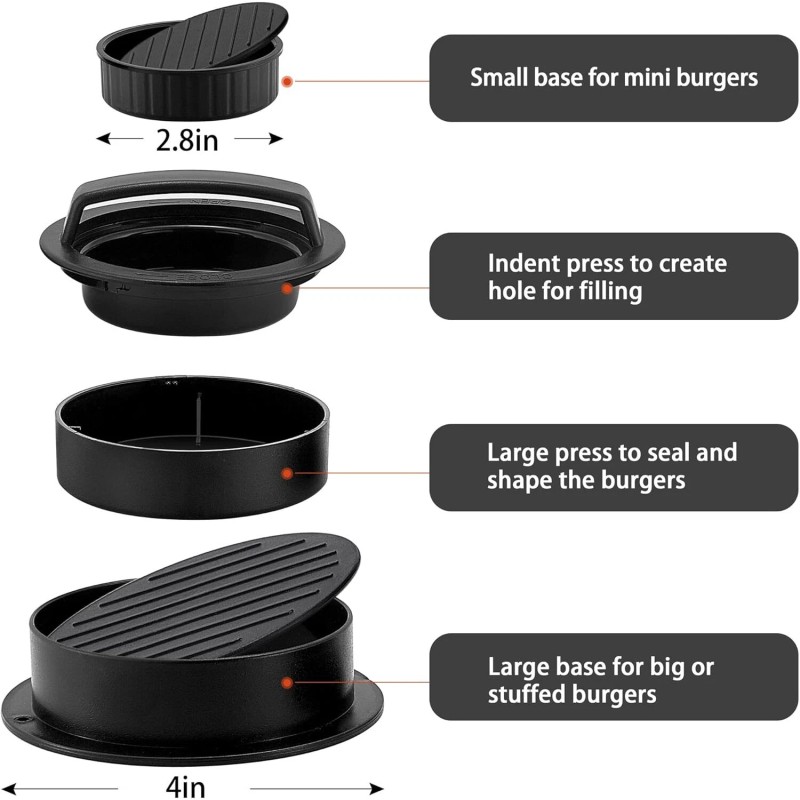 The burger patty maker have 2 different size of patty molds, you can not only make sliders and mini burgers but also stuffed burgers. Making homemade hamburger no longer a difficult task with this stuffed hamburger press, just fill the mold with meat and some fillings you like and press it, pop out the non-stick bottom with hand directly, then you will get a perfectly round burger patty