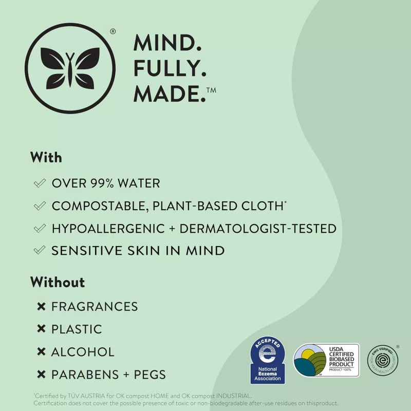 • Clean up all of life’s messes. Compostable, plant-based multi-use Wipes are made with over 99% water and only 7 transparent ingredients, making them gentle and safe for baby’s sensitive skin but great for the whole family