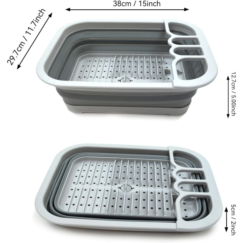 Collapsible Dish Drainer with Drainer Board - Foldable Drying Rack Set - Portable Dinnerware Organizer - Space Saving Kitchen Storage Tray (1, Grey)