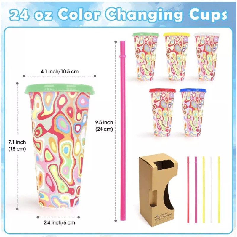 🏖️ Cups with Colorful Pattern - You will get 5 eye-catching style reusable cups with 5 straws, and 5 lids in a small box . The size of cup is 7.1 in * 4.1 in, Can hold 24oz of iced drinks. Make your day a little brighter & Special with our color changing cups