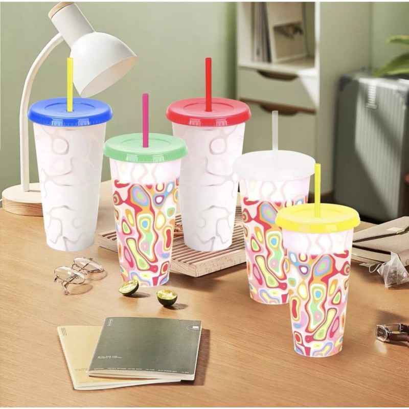 Color Changing Cups, 5-Pack 24 oz Plastic Cups with Lids and Straws, Reusable