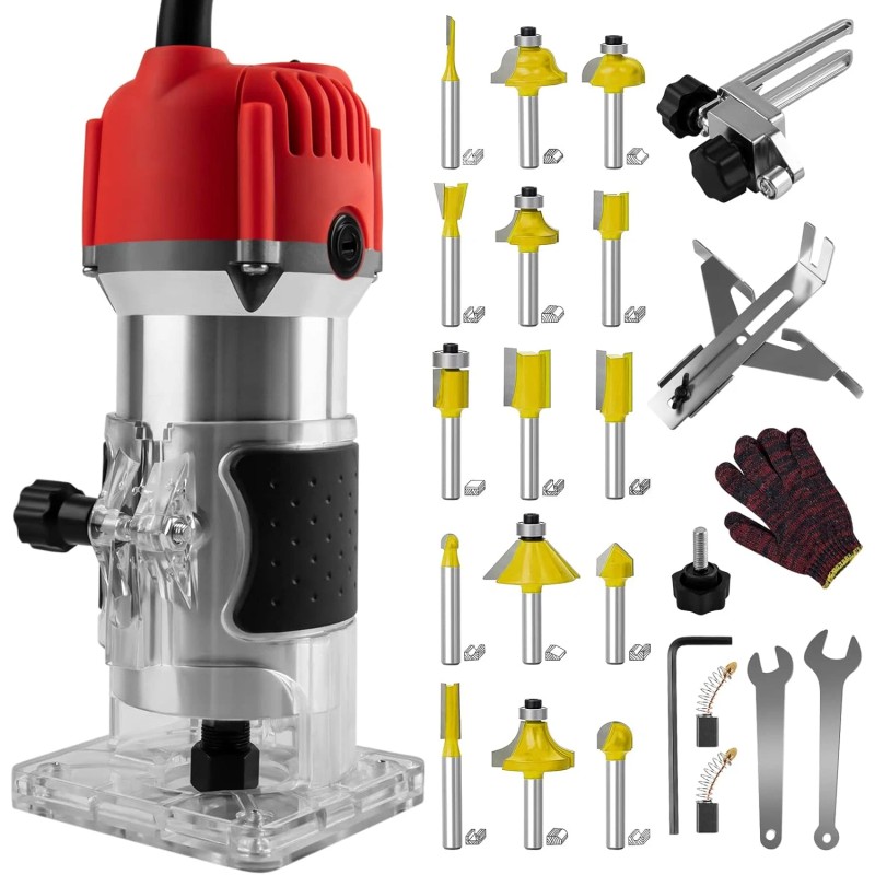 Compact Wood Router Tool 110V Electric Hand Woodworking Trimmer Palm Router Kit with Gloves 15 PCS Router Bits (800W)