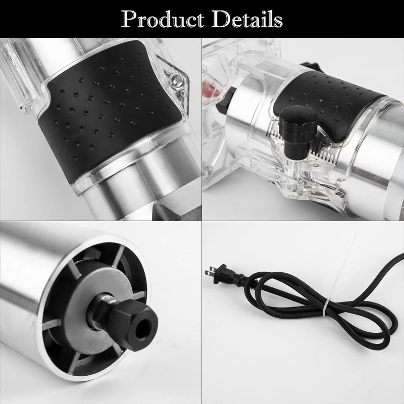 Built-in 800W powerful copper motor, 30000rpm high speed, low noise, stable operation. | Perfect size, comfortable to hold, widely used in chamfering, grooving, surface finishing, curve cutting, planing wood edge, pattern processing of wood, handicraft production etc. | The transparent base can clearly observe the wood processing process and prevent the sawdust from flying. The scaled body makes the processing more precise. |
