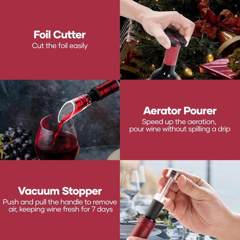 - 【Electric Wine Opener 6-in-1 Gift Set】The 6 in 1 electric wine opener set includes 1 ecectric wine opener, 1 automatic corkscrew, 1 foil cutter, 1 aerator pourer, 1 vacuum seal, 1 display base and 1 type-c charging cable. (note: The base is used for storage all wine accessory ordely and canot directly charge the bottle opener)