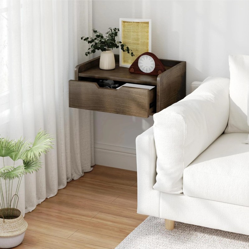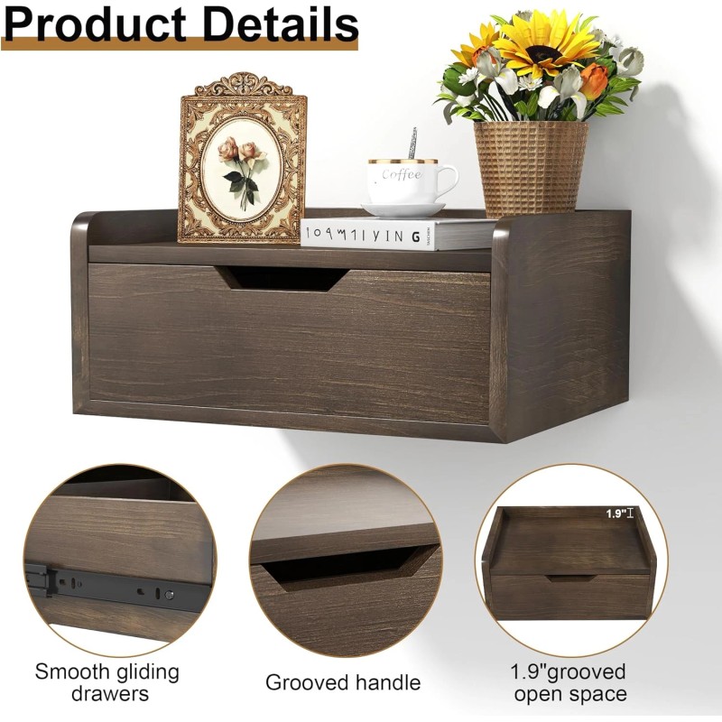 - 【Solid Wood Floating Nightstand】Brown floating nightstand is made of solid pine wood, which is highly durable and stable. The natural grain and warm tone of pine wood make it not only practical, but also add a touch of natural and cozy atmosphere to your bedroom. Whether it's modern minimalist style or rustic style, this nightstand can perfectly blend and enhance the overall decorative effect