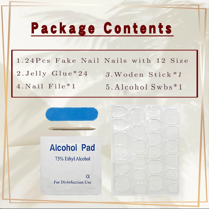 【Package Contains】24 Pcs fake nails 24 pieces of jelly glue 1 piece of alcohol cotton 1 mini nail file 1 wooden stick