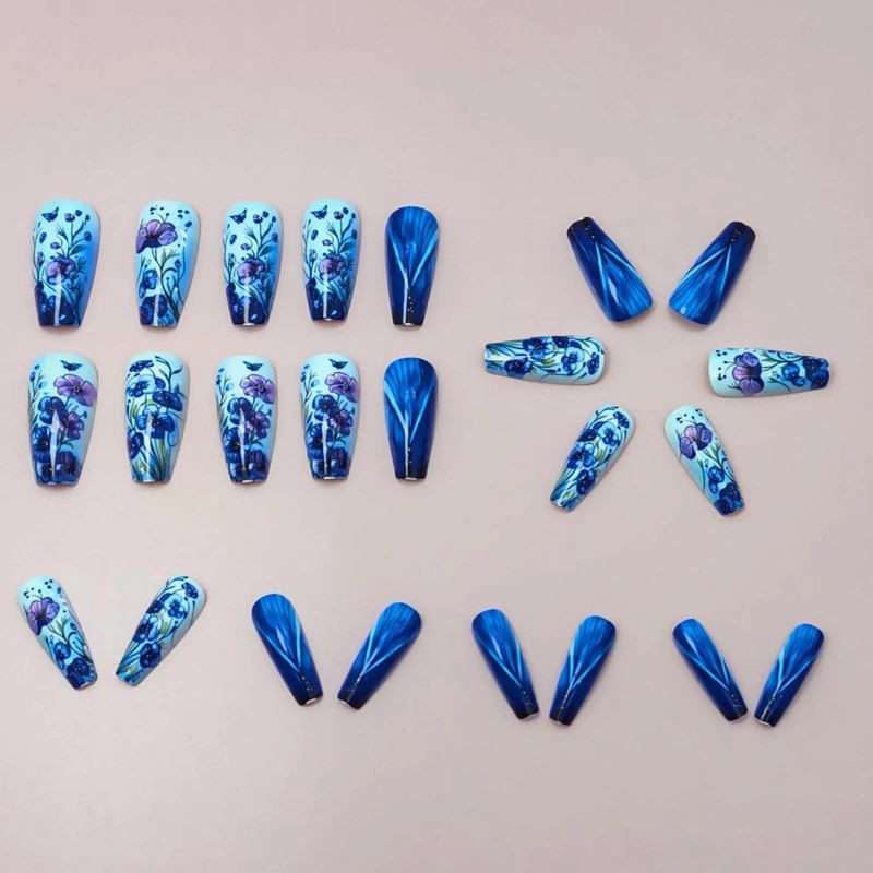 - Stylish: Flower,Press,on,Nails,Spring,Stick,Blue,Gradient,Glue,Medium