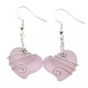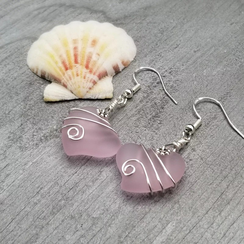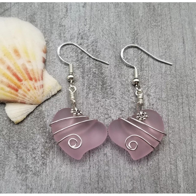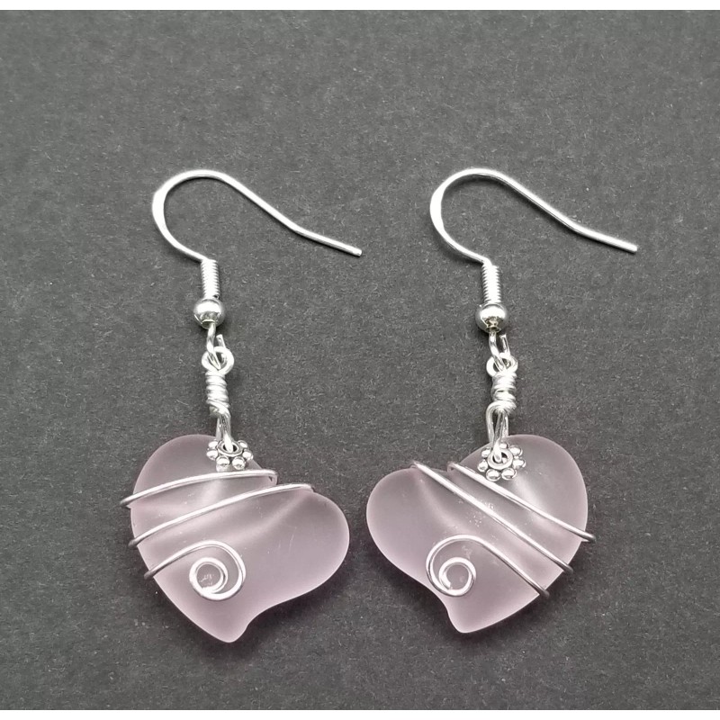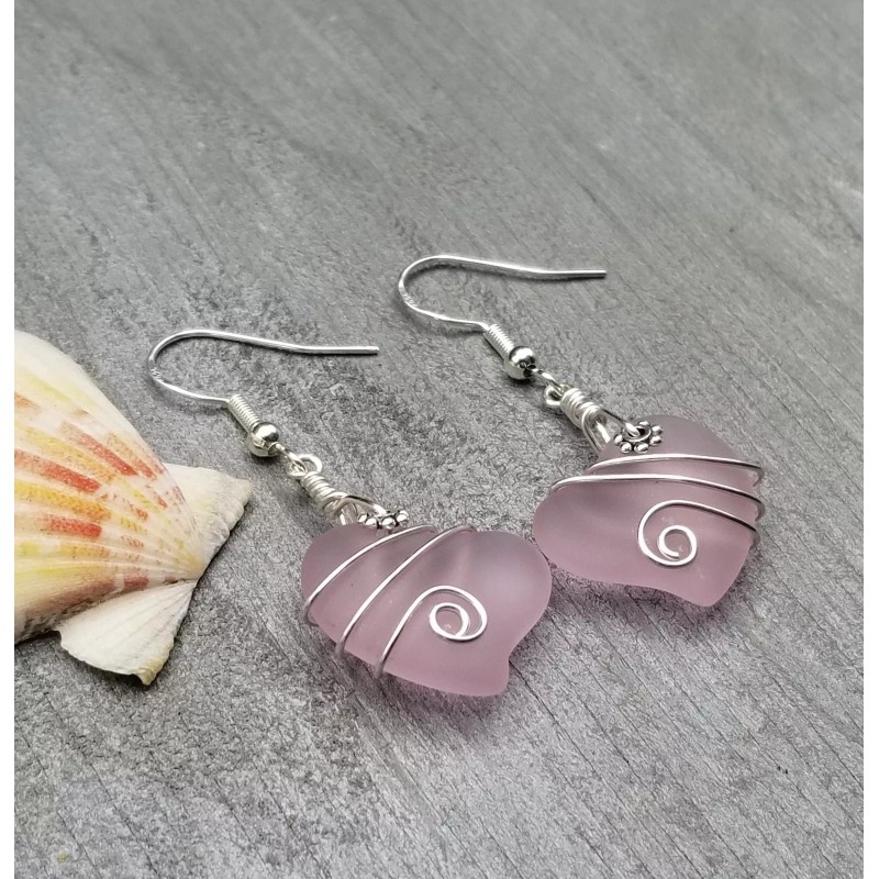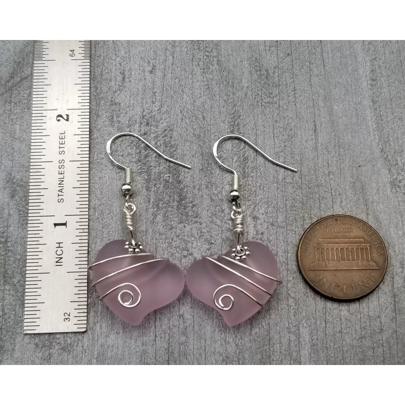 Hawaiian Jewelry Sea Glass Earrings, Wire Twin Heart Earrings Pink Earrings,