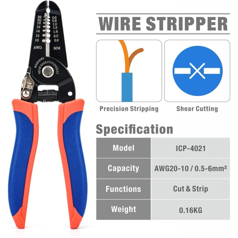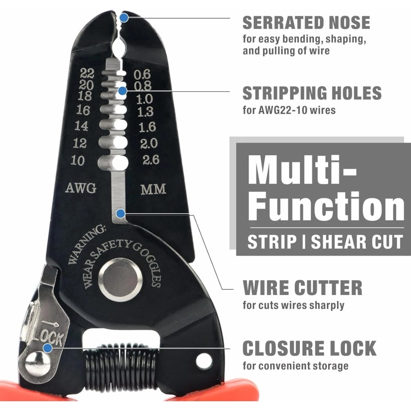 - Wire Stripper / Cutter: Wire stripper with six precision ground stripping holes for 8-18 AWG Solid and 10-20 AWG Stranded wire. Shear-like blades that provide clean cuts. Updated lock tucks out of the way. Coil spring provides fast self-opening action.
