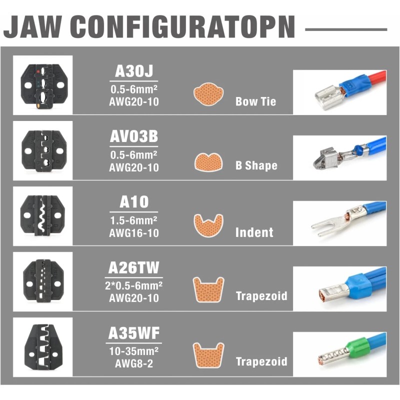 - Wire Crimp Tool Kit: IWS-30J crimping tool kit contains a crimping frame tool along with 5 exchangeable die sets, designed to making electrical connection with insulated terminal, non-insulated terminal, ferrule, open barrel connector.