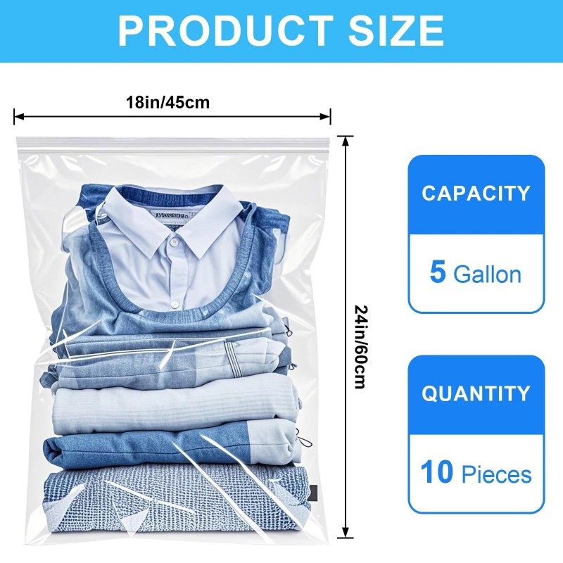 Large 5 Gallon Plastic Storage Bags (10 Pack) - 18" x 24", 2.4 Mil Thick, Resealable Clear Zipper Bags for Clothes, Travel & Moving