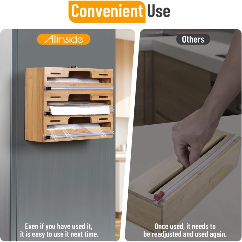 Keep Your Kitchen Tidy: Allinside 3 in 1 Magnetic Plastic Wrap Dispenser with Cutter is ideal for kitchen roll storage of aluminum foil, plastic wrap, tinfoil,wax paper, baking paper and more!
