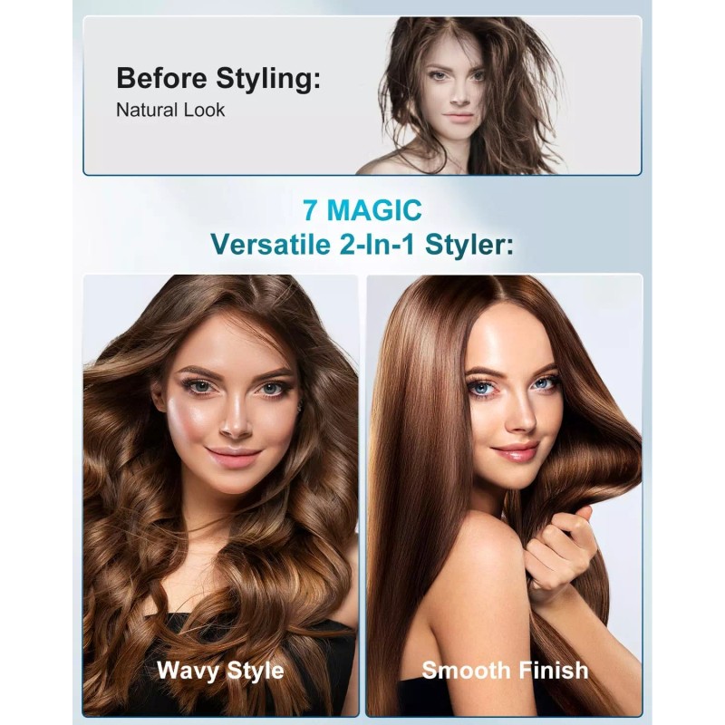 Estilo N-EN-1. Da rienda suelta a tu creatividad con nuestra plancha versátil que también funciona como plancha y rizador de cabello. Ya sea que desees mechones lisos y elegantes o quieras experimentar con ondas S, bobs o rizos voluminosos, la plancha alisadora 7MAGIC se adapta a tus necesidades de peinado. Logre peinados diversos e impresionantes sin esfuerzo, todo con un solo dispositivo.