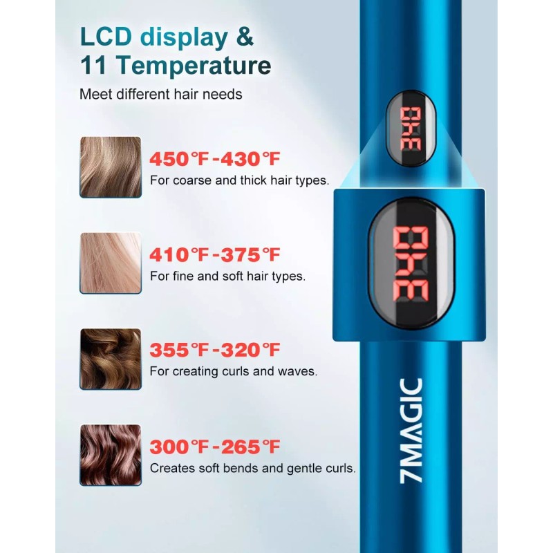 Control de temperatura versátil. Con 11 ajustes de temperatura precisos que van desde 270°F a 450°F, la plancha de pelo 7MAGIC se adapta a todo tipo de cabello. Ya sea que tenga cabello fino, normal o grueso, la pantalla LCD permite controlar y ajustar fácilmente la temperatura, lo que garantiza un peinado óptimo sin dañar el cabello. La plancha alisadora 7MAGIC valora las necesidades de todos.